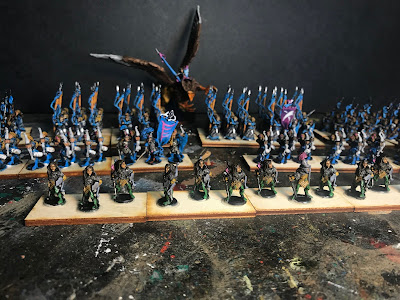 Demonworld all, of course. Missing a couple of elite units, Commanders, and Cav units. Cav is always my dessert for an army so I do them last. Almost ready. Anyway. They look good on the table. Once completed. I think I will go back and do the bases for all my 15mm Armies. Empire, Wood Elves, Orcs, Undead, and High Elves so they are done and dusted and ready for proper play and photos.